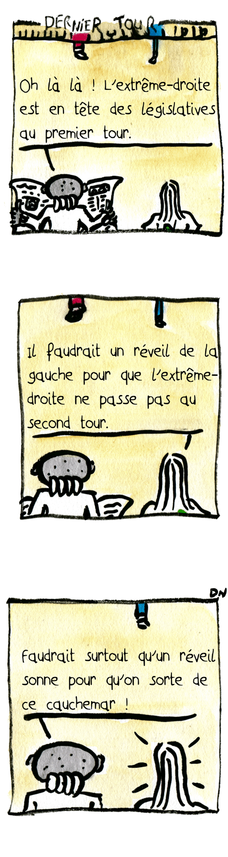 DERNIER TOUR : – Oh là là ! L’extrême-droite est en tête des législatives au premier tour. – Il faudrait un réveil de la gauche pour que l’extrême-droite ne passe pas au second tour. – Faudrait surtout qu’un réveil sonne pour qu’on sorte de ce cauchemar.