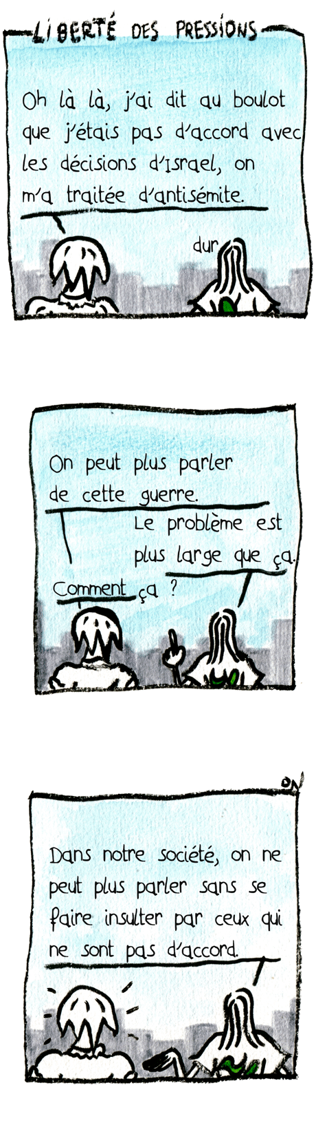 LIBERTÉ DES PRESSIONS : – Oh là là, j’ai dit au boulot que j’étais pas d’accord avec les décisions d’Israël, on m’a traitée d’antisémite. – dur – On peut plus parler de cette guerre. – Le problème est plus large que ça. – Comment ça ? – Dans notre société, on ne peut plus parler sans se faire insulter par ceux qui ne sont pas d’accord.