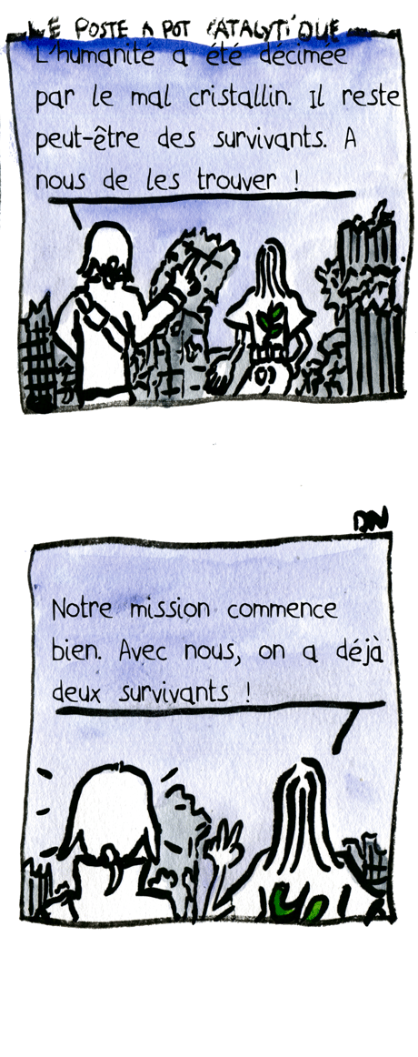 LE POSTE A POT CATALYTIQUE : – L’humanité a été décimée par le mal cristallin. Il reste peut-être des survivants. A nous de les trouver ! – Notre mission commence bien. Avec nous, on a déjà deux survivants.