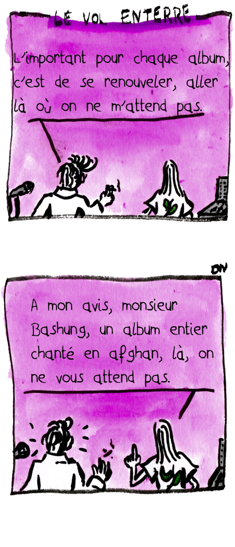 LE VOL ENTERRE : -L’important pour chaque album, c’est de se renouveler, aller là où on ne m’attend pas. – A mon avis, monsieur Bashung, un album entier chanté en afghan, là, on ne vous attend pas.