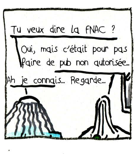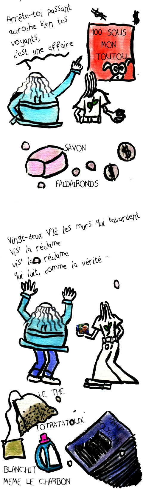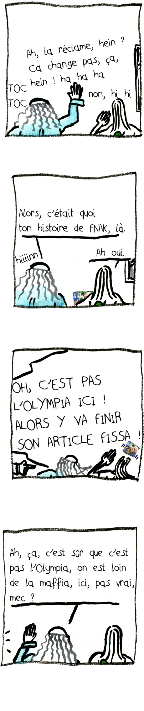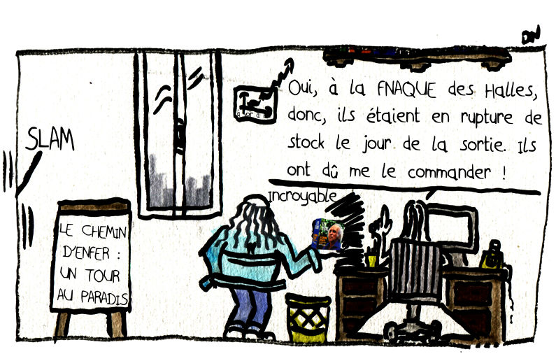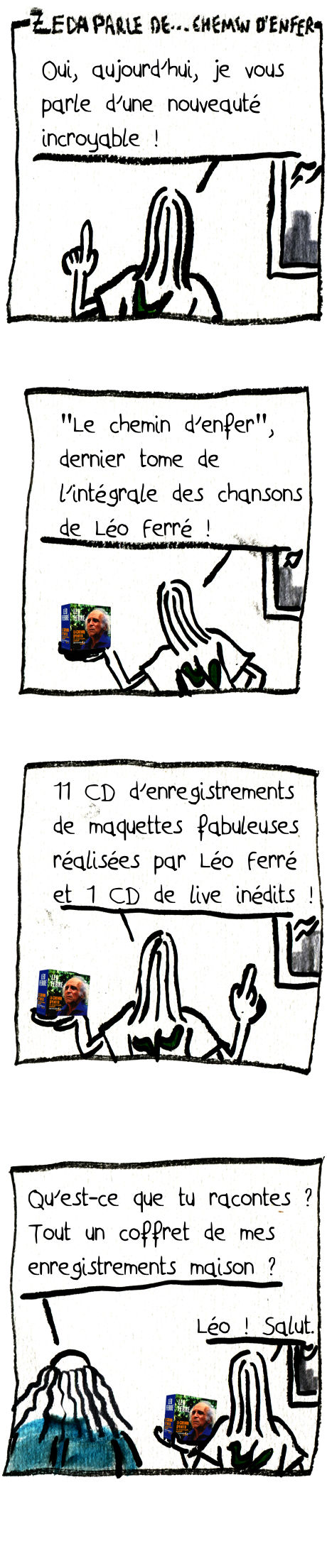 ZEDA PARLE DE… CHEMIN D’ENFER : – Oui, aujourd’hui, je vous parle d’une nouveauté incroyable ! – « Le chemin d’enfer », dernier tome de l’intégrale des chansons de Léo Ferré ! – 11 CD d’enregistrements de maquettes de chansons fabuleuses réalisées par Léo Ferrré et un CD de live inédits ! – Qu’est-ce que tu racontes ? tout un coffret de mes enregistrements maison, ? – Léo ! Salut. – Oui, c’est Mathieu, votre fils, qui l’a réalisé. – Ca alors, fais voir ! – Pauvre Mathusalem, tous ces efforts, ce beau coffret, pour rien. – Mais pourquoi vous dites ça ? – Mais allons, des enregistrements que j’ai faits comme ça, à la maison, sans soin, même nettoyés, qui ça va intéresser ? – Détrompez-vous, je suis allé à la FNAK comme ça pour acheter votre coffret et… – Tu veux dire la FNAC ? – Oui, mais c’était pour pas faire de pub non autorisée… – Ah, je connais… Regarde… – Arrête-toi passant, accroche bien tes voyants, c’est une affaire (100 SOUS MON TOUTOU / SAVON FAIDESRONDS) – Vingt-deux v’là les murs qui bavardent, Vis’ la réclame, vis’ la réclame, Qui luit comme la vérité (LE THE TOTRATATOUX / BLANCHIT MÊME LE CHARBON / PIN-UP POLYCOPIE) – AH, la réclame, hein ! Ca change pas, ça, hein ! ah ah ah – Non, hi hi (TOC TOC) – Alors, c’était quoi ton histoire de FNAK, là. – Ah oui. (hiiinnn) – OH, C’EST PAS L’OLYMPIA ICI, ALORS Y VA FINIR SON ARTICLE FISSA ! – Ah, c’est sûr que c’est pas l’Olympia, on est loin de la maffia ici, pas vrai, mec ? (SLAM / LE CHEMIN D’ENFER : UN TOUR AU PARADIS / à voir à lire) – Oui, à la FNAQUE des Halles, donc, ils étaient en rupture de stock le jour de la sortie. Ils ont dû me le commander. – Incroyable