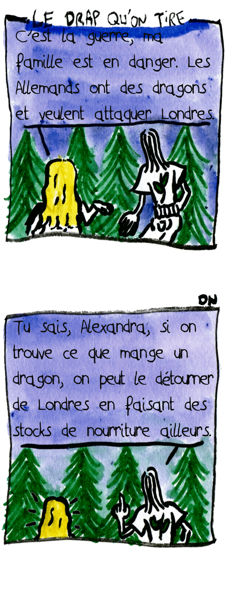 LE DRAP QU’ON TIRE : – C’est la guerre, ma famille est en danger. Les Allemands ont des dragons et veulent attaquer Londres. – Tu sais, Alexandra, si on trouve ce que mange un dragon, on peut le détourner de Londres en faisant des stocks de nourriture ailleurs.