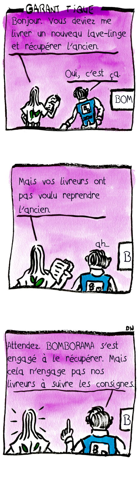 GARANT TIQUE : – Bonjour. Vous deviez me livrer un lave-linge et récupérer l’ancien. – Oui, c’est ça. – Mais vos livreurs ont pas voulu prendre l’ancien. – ah… – Attendez. BOMBORAMA s’est engagé à le récupérer. Mais cela n’engage pas nos livreurs à suivre les consignes.