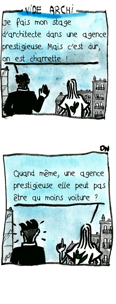 VIDE ARCHI : – Je fais mon stage dans une agence prestigieuse. Mais c’est dur, on est charrette. – Quand même, une agence prestigieuse, elle peut pas être au moins voiture ?