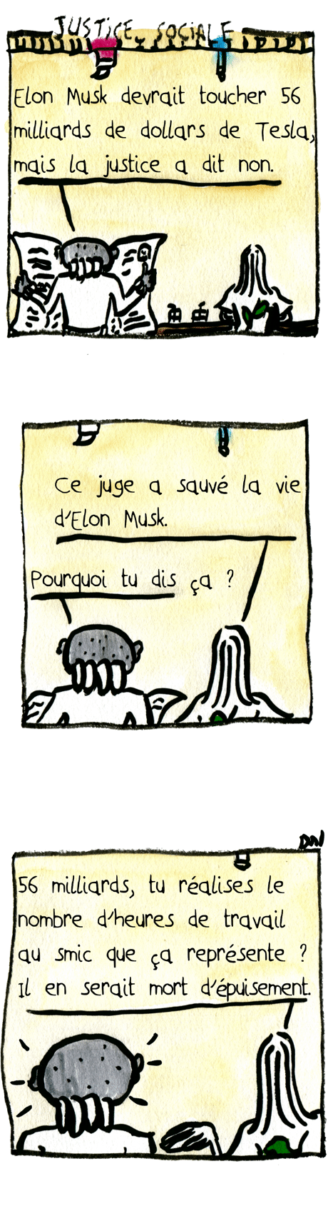 JUSTICE SOCIALE : – Elon Musk devrait toucher 56 milliards de dollars de Tesla, mais la justice a dit non. – Ce juge a sauvé la vie d’Elon Musk. – Pourquoi tu dis ça ? – 56 milliards, tu réalises