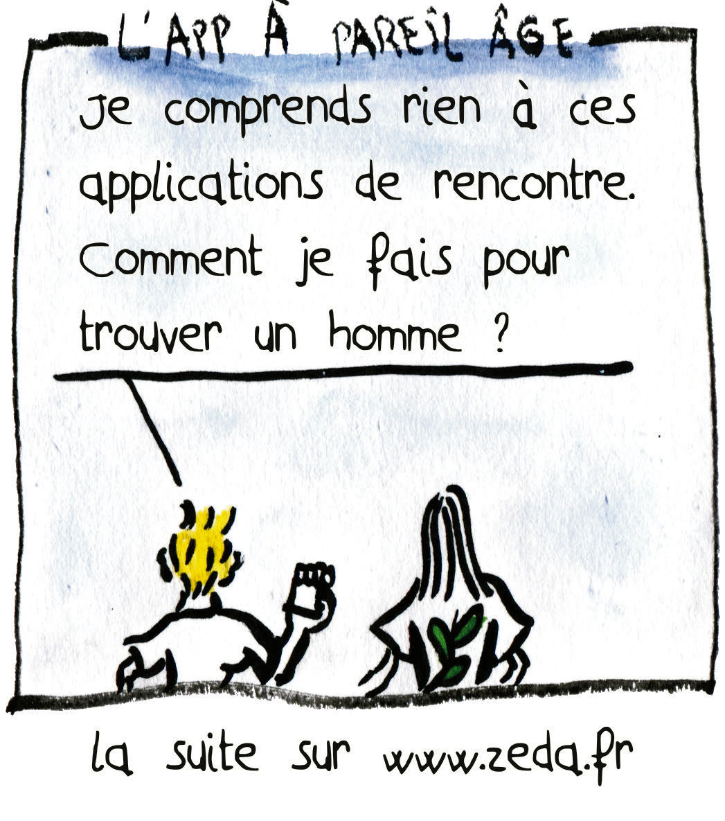 L’APP A PAREIL ÂGE : – Je comprends rien à ces applications de rencontre. Comment je fais pour trouver un homme ? – Tu peux aller dans un bar et demander à un gars de t’expliquer comment ça marche et tu fais d’une pierre deux coups !