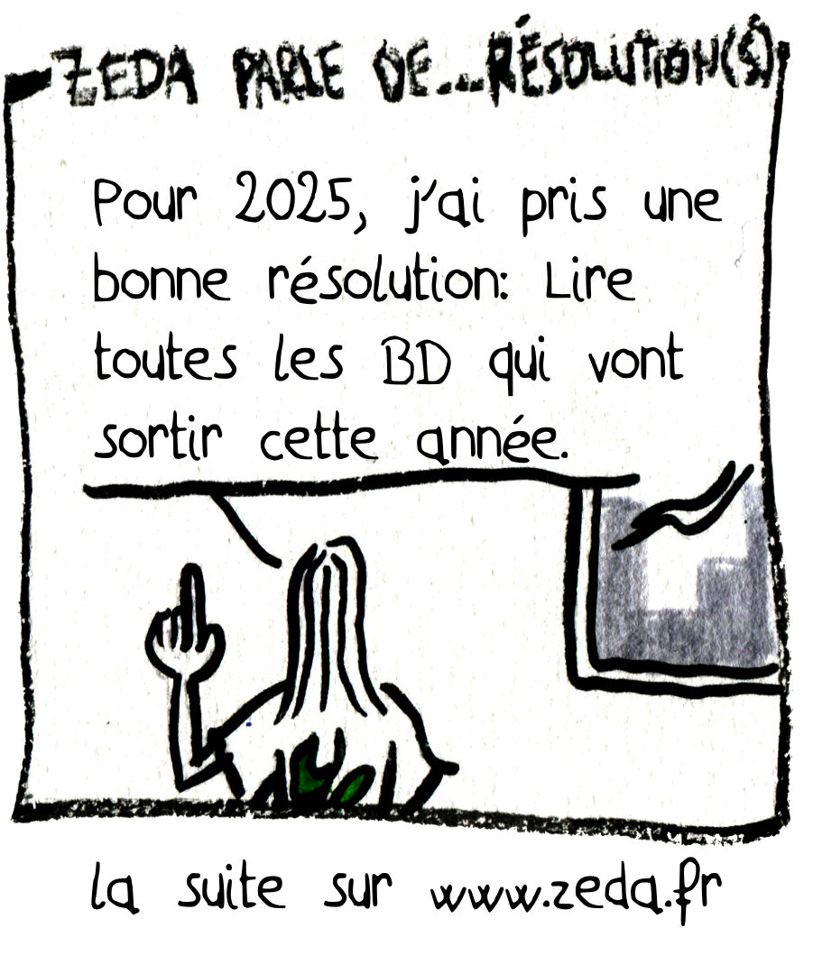 ZEDA PARLE DE… RÉSOLUTION(S) : – Pour 2025, j’ai pris une bonne résolution : Lire toutes les BD qui vont sortir cette année. – Il y a eu plus de 7000 BD sorties en 2024. Si je me base là-dessus, ça fait par jour… (tap tap toc toc 20) – Ah quand même… si je prends 45 minutes en moyenne pour lire une BD, ça va faire combien d’heures par jour… (hiiinn) – A QUOI Y RÊVASSE AU LIEU D’ÉCRIRE SES ARTICLES ? ! – Justement, si je dois lire toutes les BD qui vont sortir cette année, ça fait 20 par jour. – N’IMPORTE QUOI ! Y DONNE SA CALCULETTE, ON VA VÉRIFIER CA ! (tap tap) – J’espère que je me suis pas trompé. – … – Alors ? – OK, CA FAIT 15H PAR JOUR DE LECTURE, PLUS LE TEMPS D’ÉCRIRE LES 20 ARTICLES QUOTIDIENS, Y FERAIT MIEUX DE S’Y METTRE ! (SLAM / MARCHE DE LA BD : SURPRODUCTION 2025 / à voir à lire) – J’aurais dû lui parler du stockage des BD, ça le ferait peut-être changer d’avis…