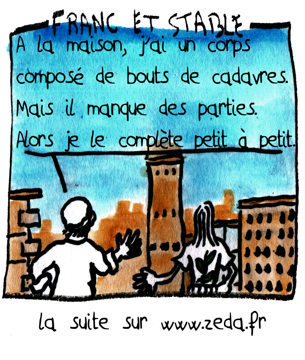FRANC ET STABLE : – A la maison, j’ai un corps composé de bouts de cadavre. Mais il manque des parties, alors je le complète petit à petit. – Comme ça, quand le corps sera complet, vous pourrez l’enterrer dignement, c’est ça ?