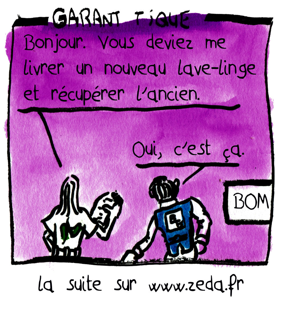 GARANT TIQUE : – Bonjour. Vous deviez me livrer un lave-linge et récupérer l’ancien. – Oui, c’est ça. – Mais vos livreurs ont pas voulu prendre l’ancien. – ah… – Attendez. BOMBORAMA s’est engagé à le récupérer. Mais cela n’engage pas nos livreurs à suivre les consignes.