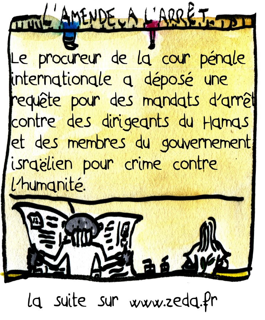 L’AMENDE A L’ARRÊT : – Le procureur de la cour pénale internationale a déposé une requête pour des mandats d’arrêt contre des dirigeants du Hamas et des membres du gouvernement israélien pour crime contre l’humanité. – Le Hamas et le gouvernement israélien trouvent ça honteux et injustifié. – c’est incroyable – Finalement, ce procureur a réussi à mettre d’accord le Hamas et le gouvernement israélien.