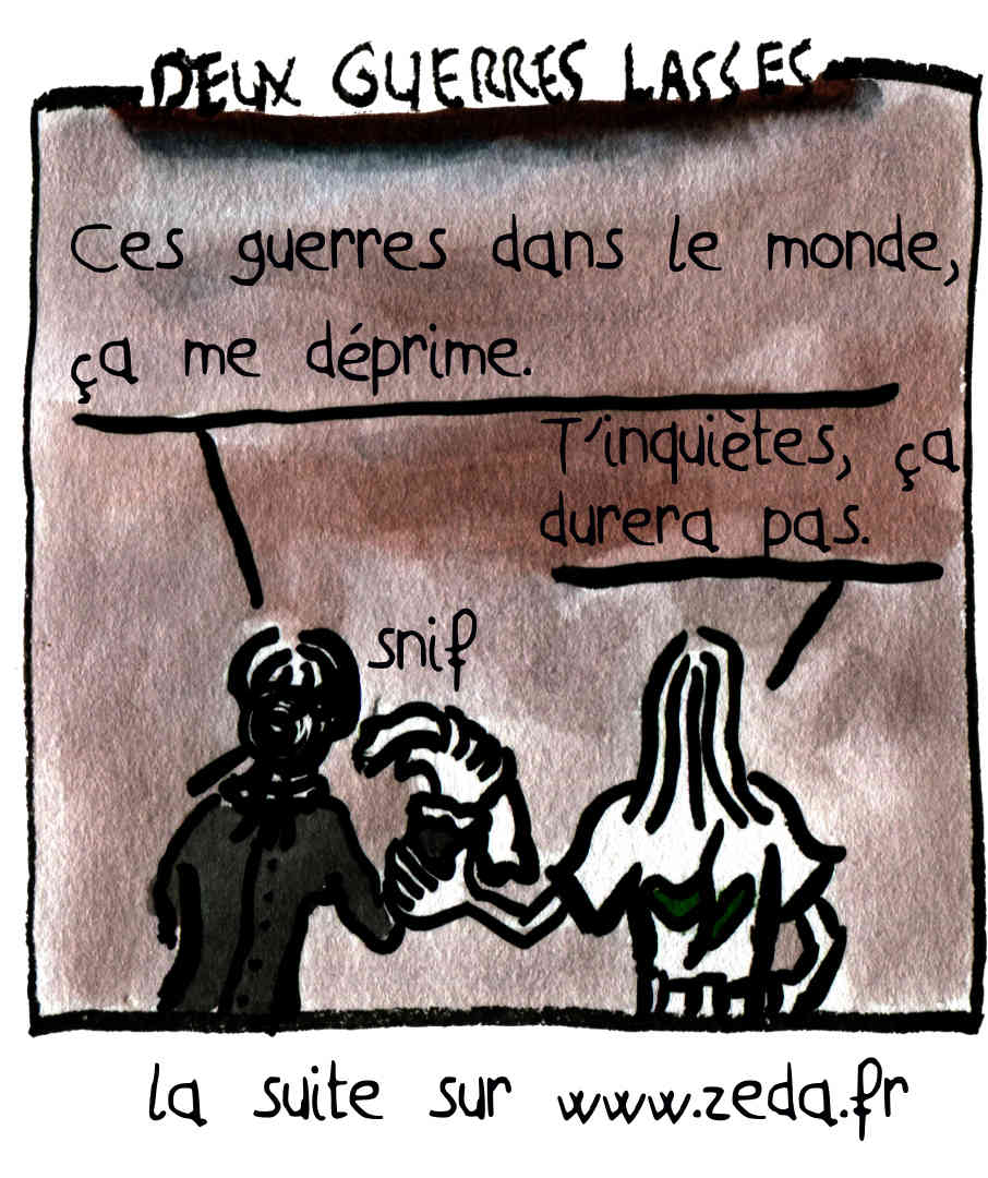 DEUX GUERRES LASSES : – Ces guerres dans le monde, ça me déprime. (snif) – T’inquiètes, ça durera pas. – A un moment, il restera plus personne à envoyer au front. Ils seront bien obligés d’arrêter.