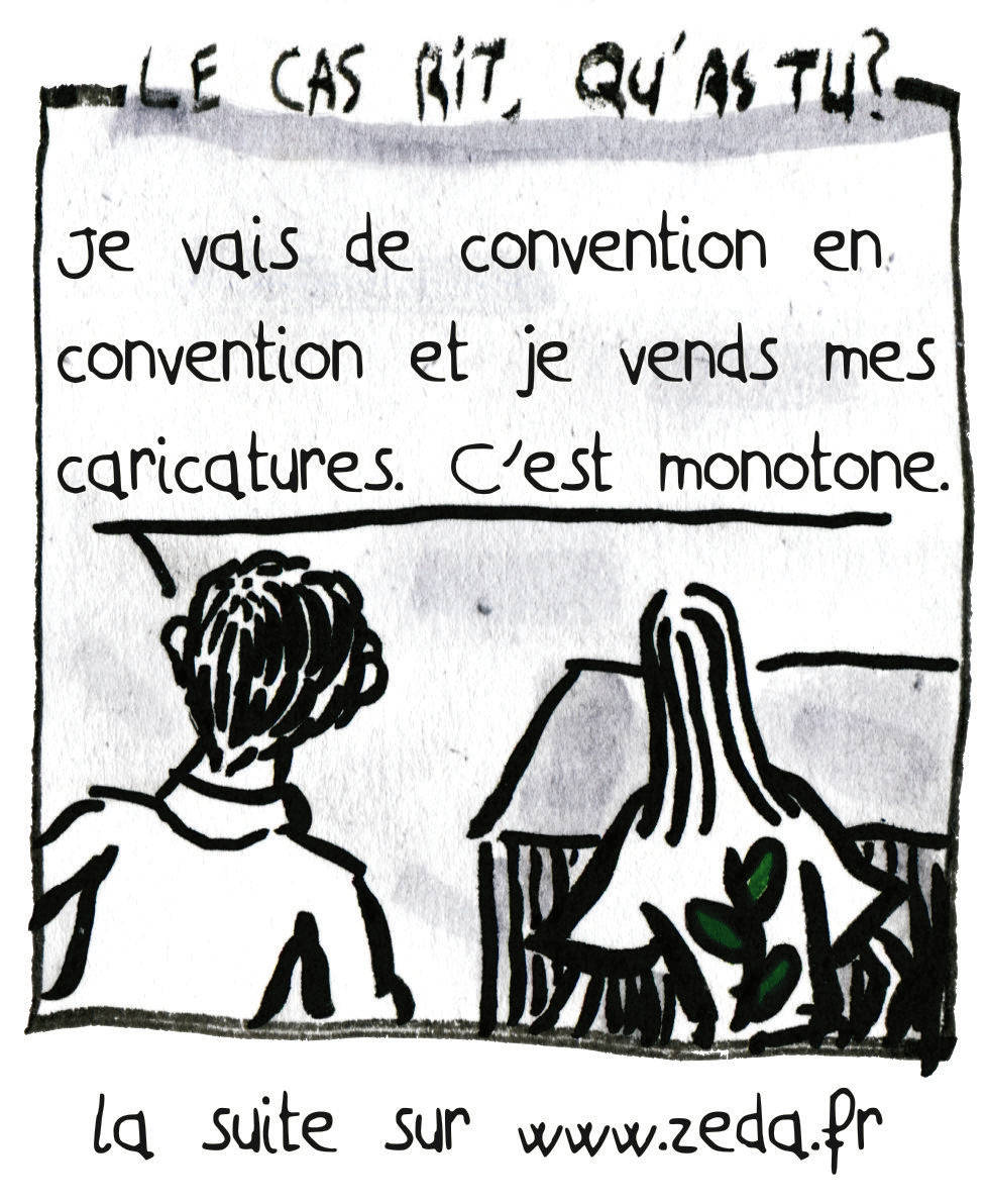 LE CAS RIT, QU’AS-TU ? : – Je vais de convention en convention et je vends des BD, c’est monotone. – Peut-être que tu devrais essayer le dessin de paysage, ça change tout le temps.