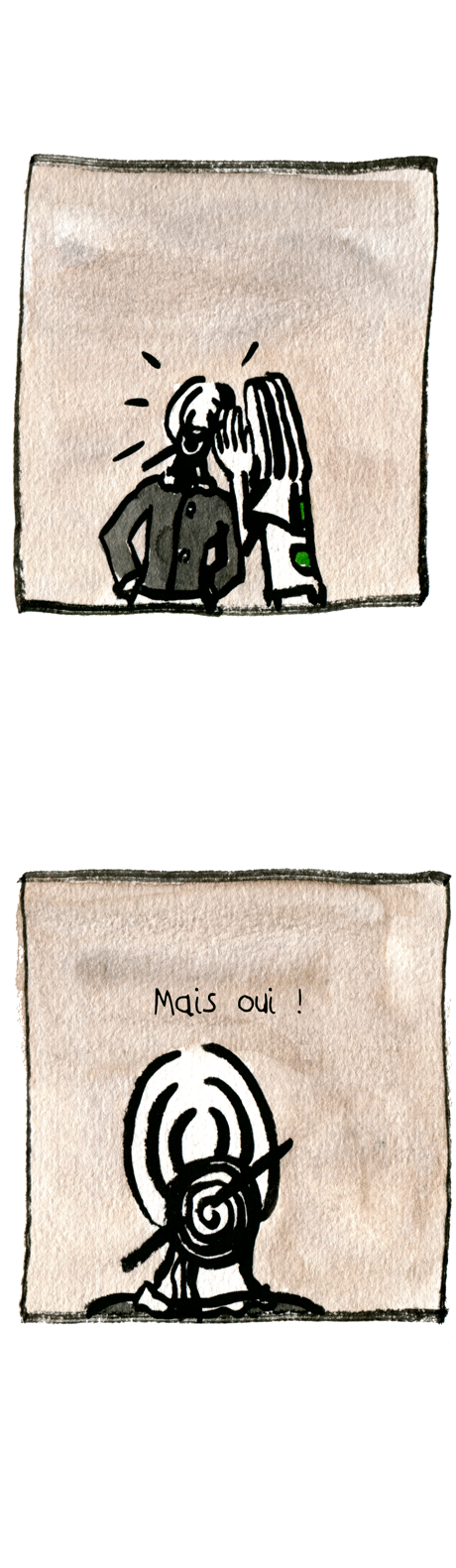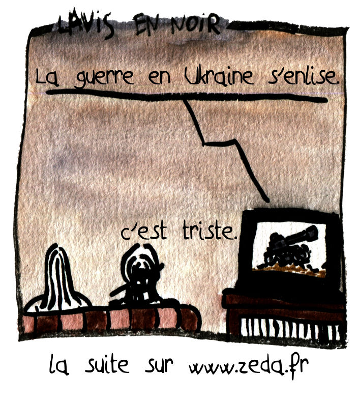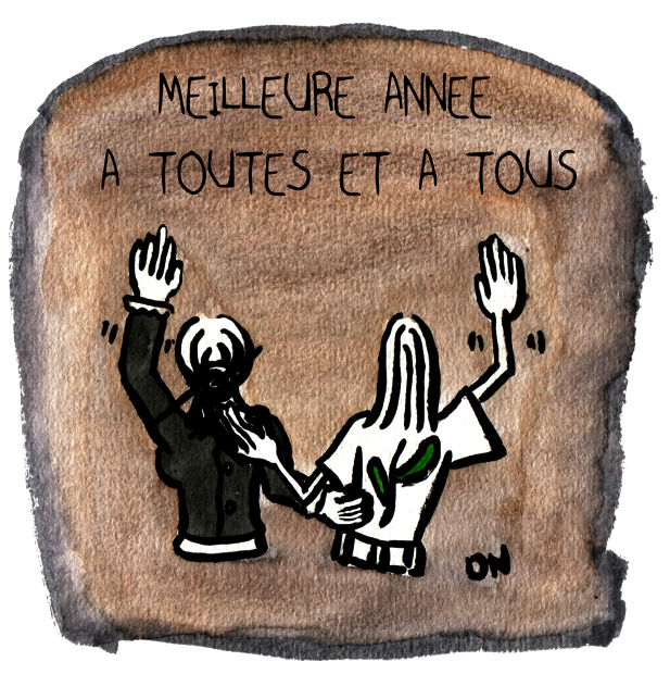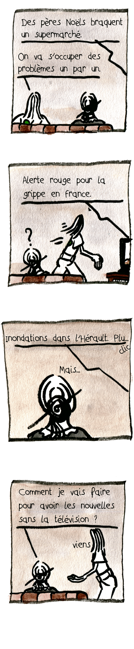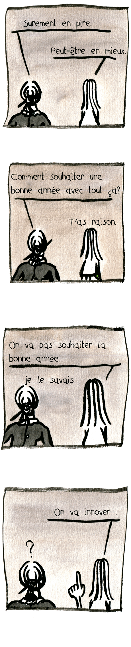 LAVIS EN NOIR : – La guerre en Ukraine s’enlise. – c’est triste – Attentat meurtrier en Australie. – Le monde va mal. – Expulsion de travailleurs Mexicains aux USA. – Demain, c’est la nouvelle année, et ce sera pire. snif – Attentat à la voiture piégée à Moscou. – Qu’est-ce qu’on va faire ? snif – Des pères noël braquent un supermarché. – On va s’occuper des problèmes un par un. – Alerte rouge pour la grippe en France. – ? – Inondations dans l’Hérault. Plu… (clic) – Mais… – Comment je vais faire pour avoir les nouvelles sans la télévision ? – viens. – Laisse tomber les chaînes d’infos continues. Tu peux lire le journal. – snif – Et puis, y a pas que les mauvaises nouvelles. Tu peux aussi chercher les bonnes. – Mais l’avenir est si sombre. – Oui, mais il est pas écrit. Chaque année, tout peut changer. – snif – Surement en pire. – Peut-être en mieux. – Comment souhaiter une bonne année avec tout ça ? – T’as raison. – On va pas souhaiter la bonne année. – je le savais – On va innover ! – ? – Mais oui ! – MEILLEURE ANNÉE A TOUTES ET À TOUS !