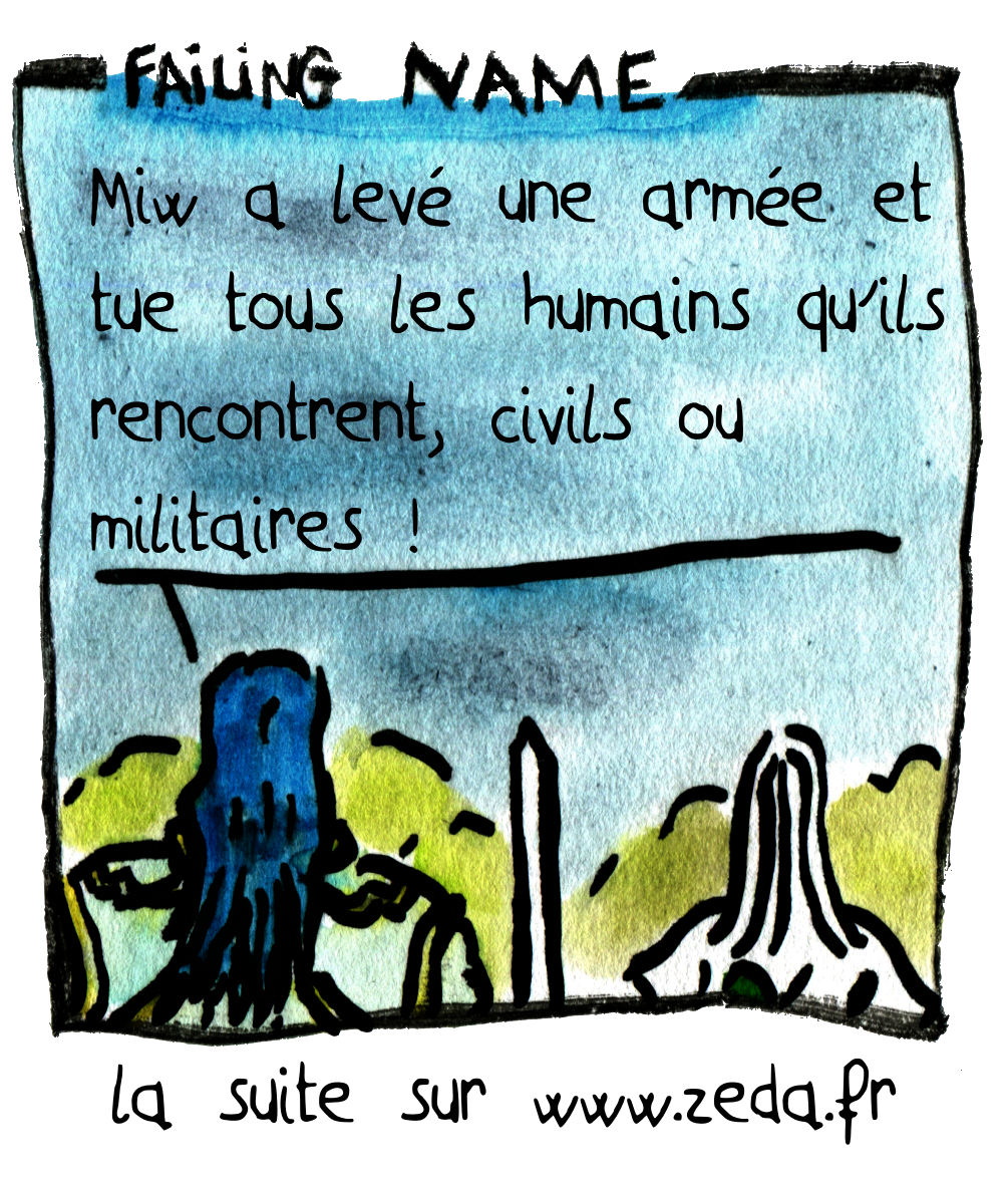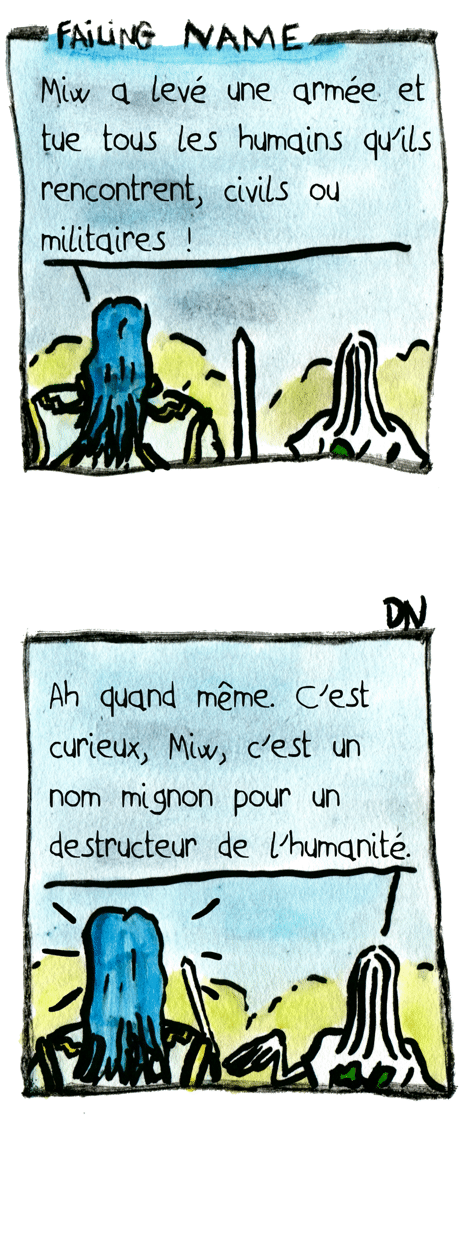 FAILING NAME : – Miw a levé toute une armée et tue tous les humains qu’ils croisent, militaires ou civils. – Ah, quand même. C’est curieux, Miw, c’est un nom mignon pour un destructeur de l’humanité.
