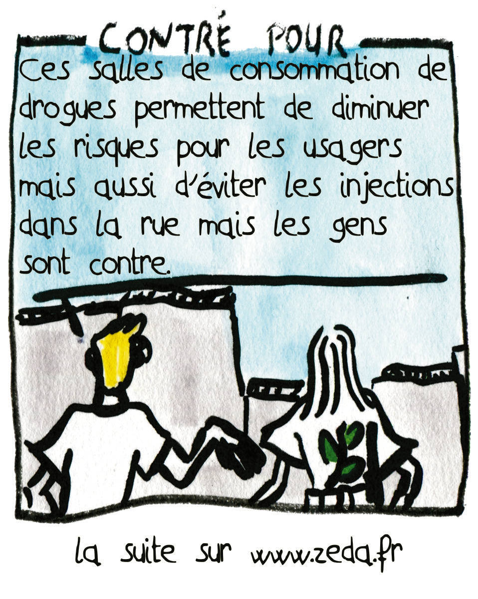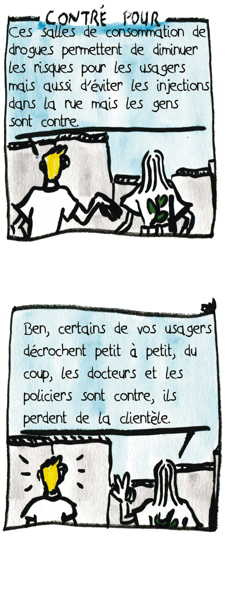 CONTRE POUR : – Ces salles de consommation de drogues permettent de diminuer les risques mais aussi d’éviter les injections sauvages dans la rue mais les gens sont contre. – Ben, certains de vos usagers décrochent petit à petit, du coup, les docteurs et les policiers sont contre, ça fait perdre de la clientèle.