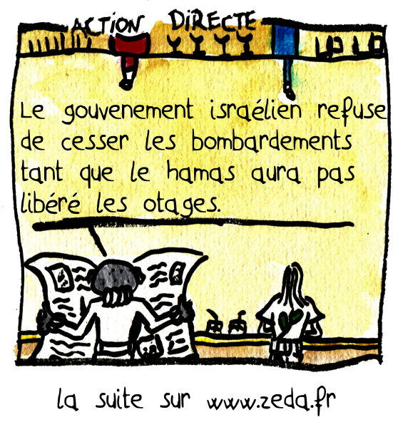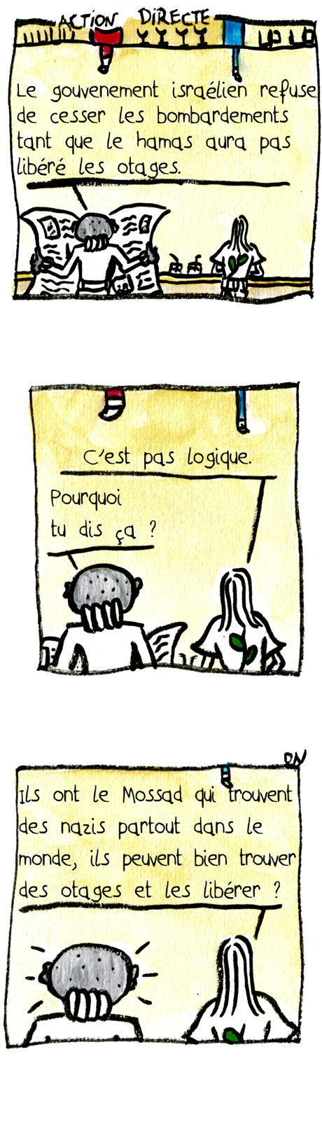 ACTION DIRECTE : – Le gouvernement israélien refuse de cesser les bombardements tant que le Hamas aura pas libéré les otages. – C’est pas logique. – Pourquoi tu dis ça ? – Ils ont le Mossad qui trouve des nazis partout dans le monde, ils peuvent bien trouver les otages et les libérer ?