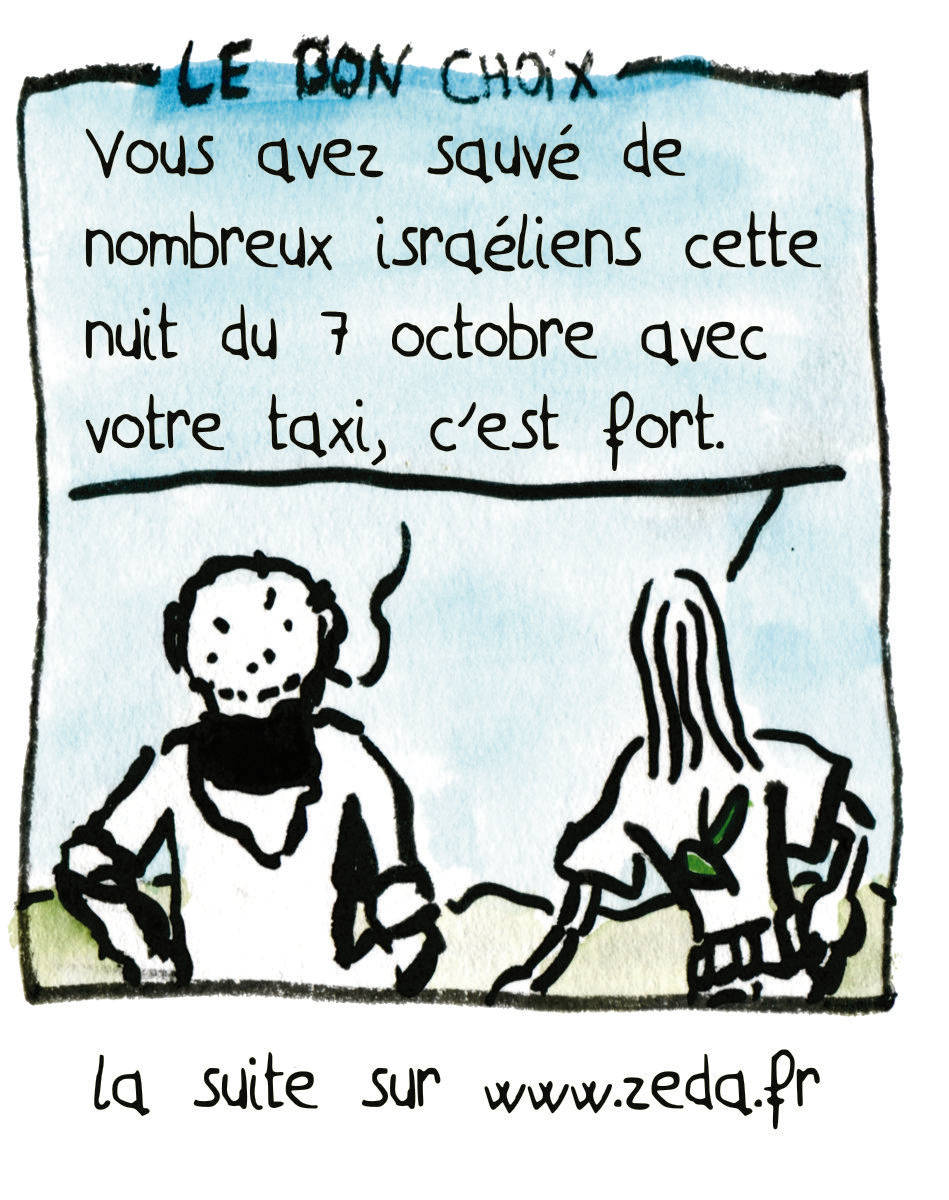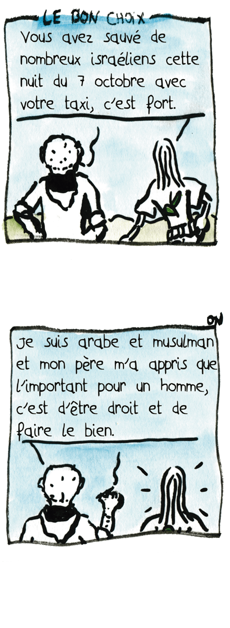 LE BON CHOIX : – Vous avez sauvé de nombreux israéliens avec votre taxi cette nuit du 7 octobre, c’est fort. – Je suis arabe et musulman, et mon père m’a appris que l’important pour un home, c’est d’être droit et de faire le bien.