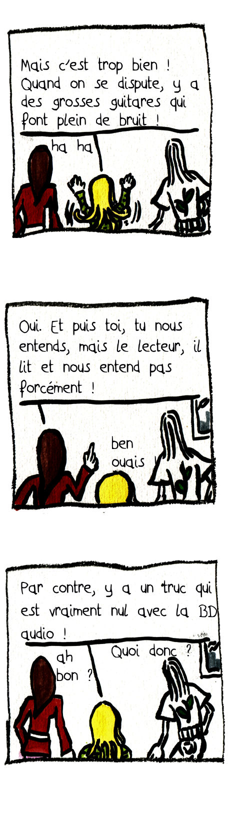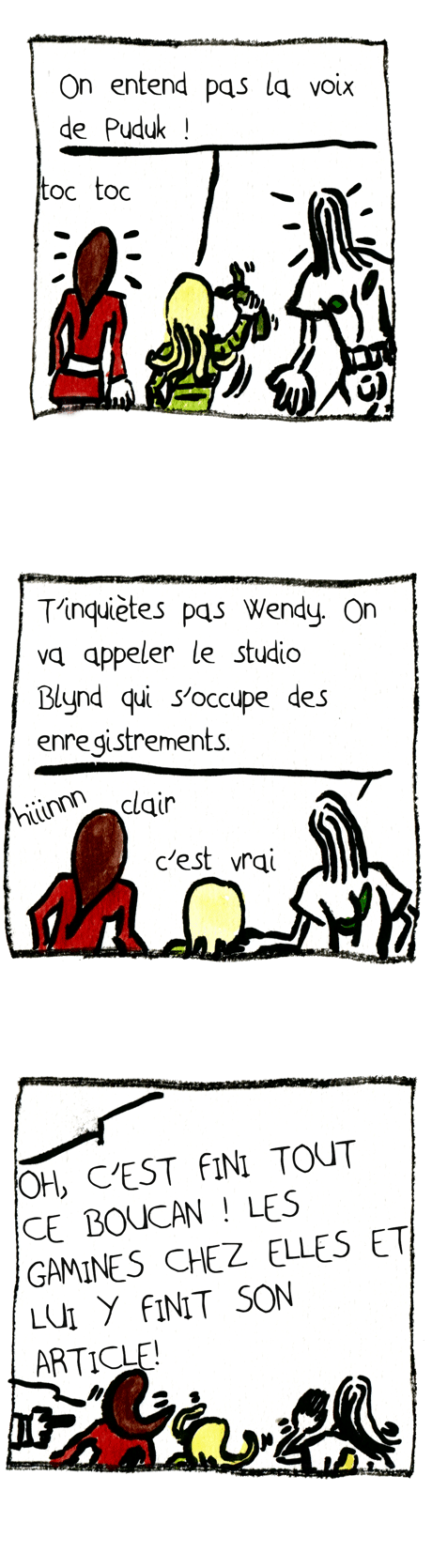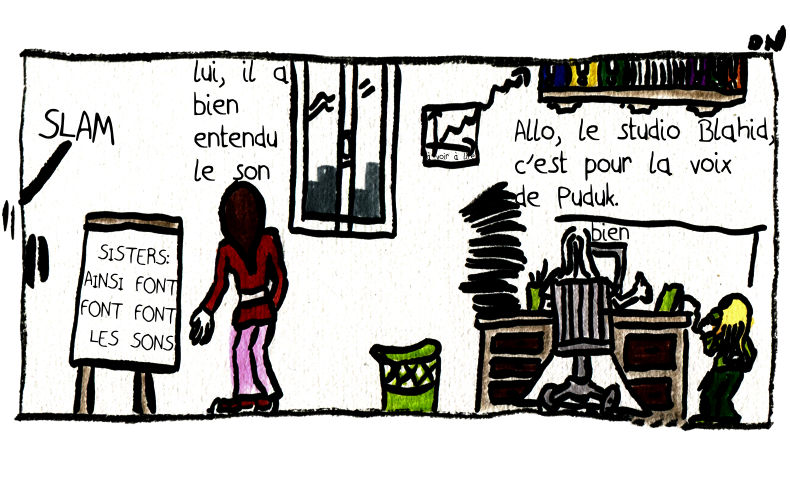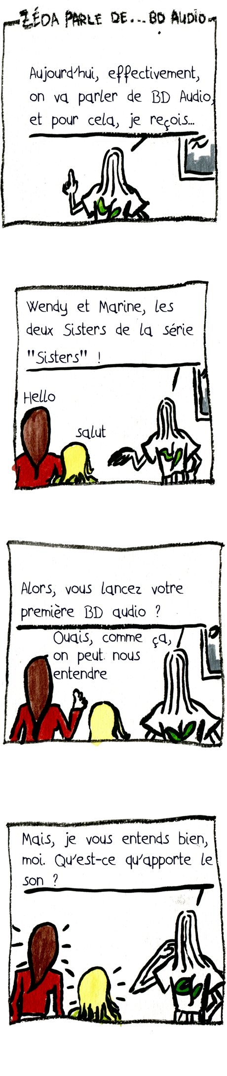 ZEDA PARLE DE… BD AUDIO : – Aujourd’hui, effectivement, on va parler de BD Audio, et pour cela, je reçois… – Wendy et Marine, les deux sisters de la série « SISTERS » ! – hello – salut – Alors vous lancez votre première BD Audio ? – Ouais, comme ça, on peut nous entendre. – Mais je vous entends bien, moi. Qu’est-ce qu’apporte le son ? – Mais c’est trop bien, quand on se dispute, y a des grosses guitares qui font plein de bruit ! – ha ha – Oui, et puis toi, tu nous entends, mais le lecteur, il lit et nous entend pas forcément ! – ben ouais – Par contre, y a un truc qui est vraiment nula vec la BD audio. – ah bon ? – Quoi donc ? – On entend pas la voix de Puduk ! (toc toc) – T’inquiète pas Wendy, on va appeler le studio Blynd qui s’occupe des enregistrements. – clair – c’est vrai (hhiiinnn) – OH, C’EST FINI CE BOUCAN ! LES GAMINES CHEZ ELLES ET LUI Y FINIT SON ARTICLE ! (SLAM / SISTERS : AINSI FONT FONT FONT LES SONS / à voir à lire) – Ben lu, il a bien entendu le son. – Allo, le studio Blahid, c’est pour la voix de Puduk. – bien