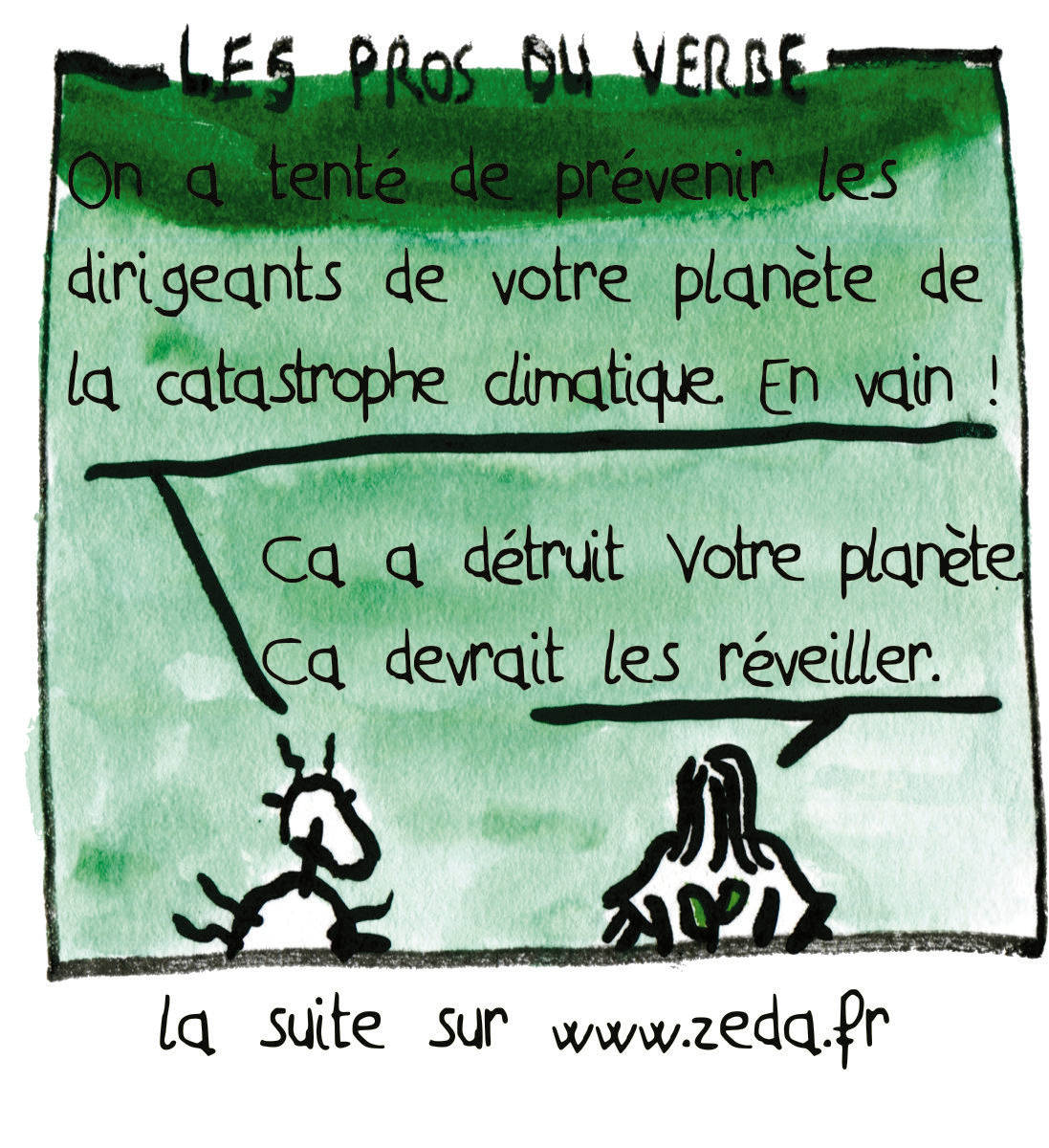 LES PROS DU VERBE : – On a tenté de prévenir les dirigeants de votre planète de la catastrophe climatique. En vain ! – CA a détruit votre planète. Ca devrait les réveiller. – Je leur ai dit. Ils m’ont répondu qu’il ne fallait pas que la paille dans leurs yeux m’empêche de voir la poutre dans les miens. J’ai rien compris.