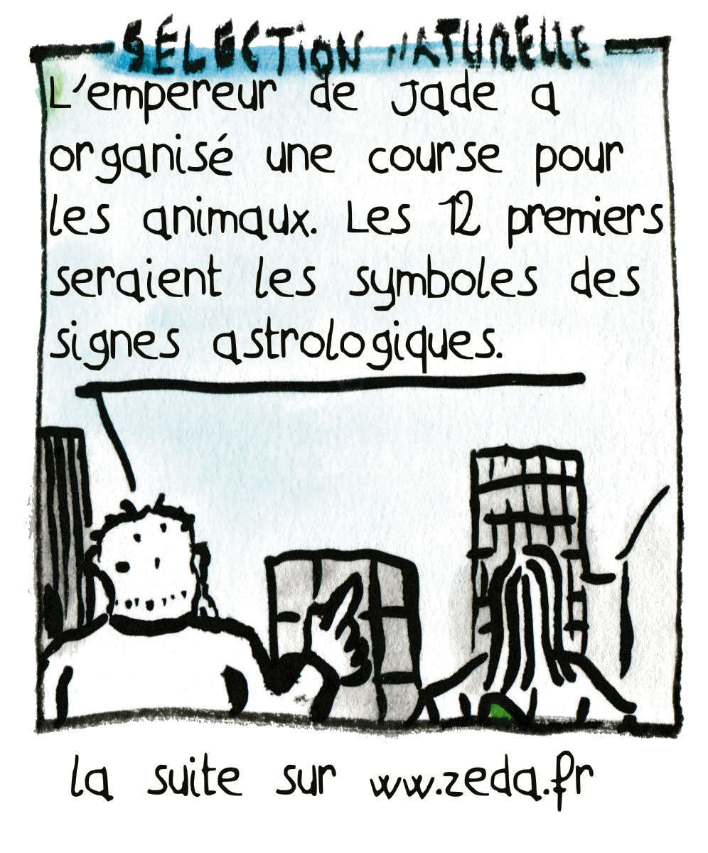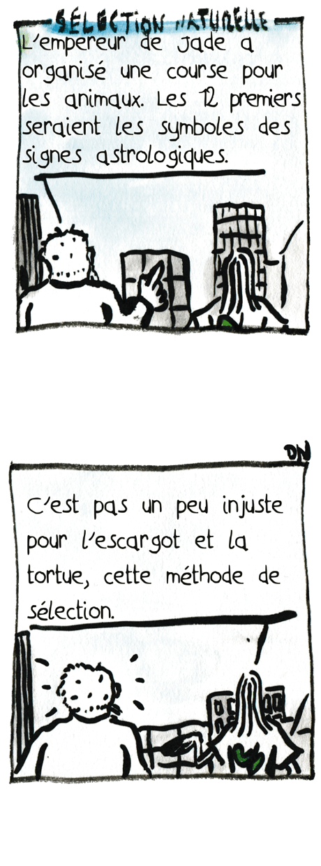 SÉLECTION NATURELLE : – L’empereur de Jade a organisé une course pour les animaux. Les douze premiers seraient les signes astrologiques. – C’est pas un peu injuste pour l’escargot et la tortue, cette méthode de sélection.