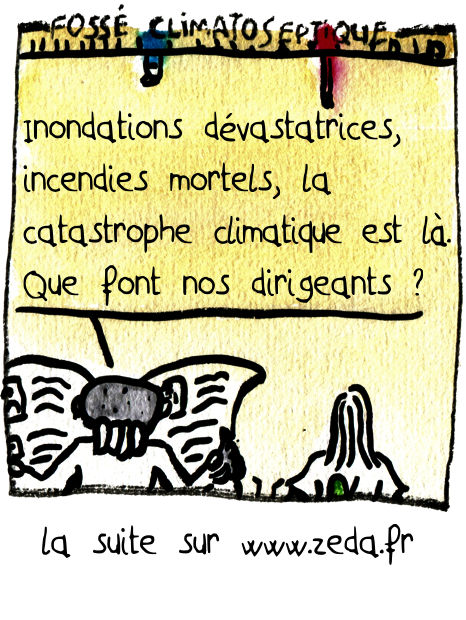 FOSSE CLIMATOSEPTIQUE : – Inondations dévastatrices, incendies mortels, la catastrophe climatique est là. Que font nos dirigeants ? – Ils se font la guerre pour pas avoir à regarder le problème en face.